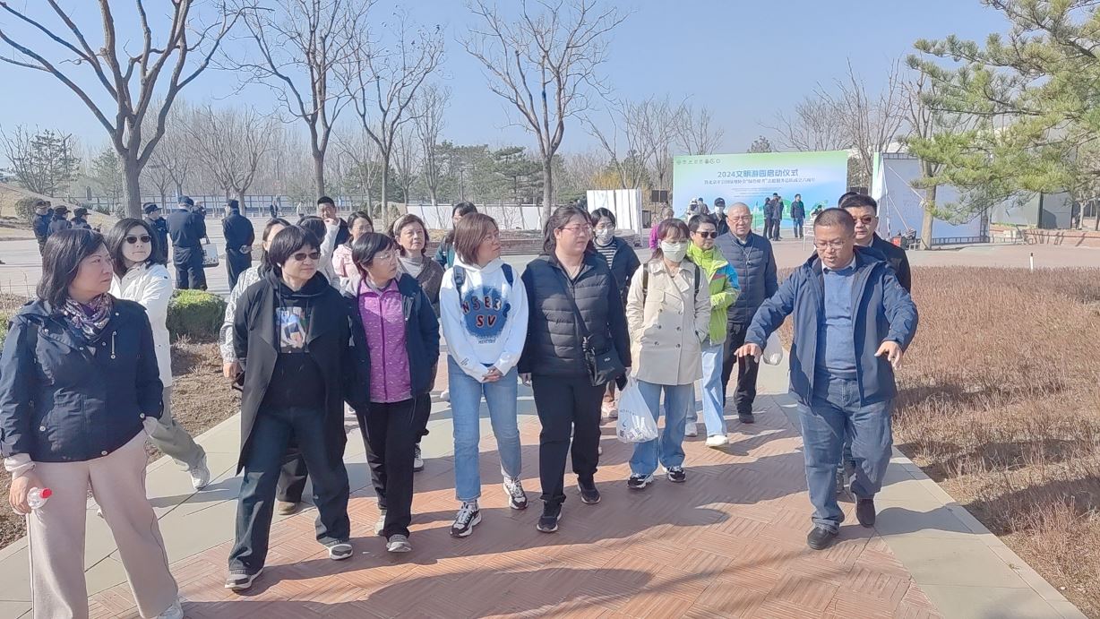 城市绿心森林公园位于大运河博物馆的东南侧,其突出了绿色生态核心、文化核心和活力核心内涵。外围建设有长5.5公里的动感活力环路,由8米宽的骑行道和3米宽的漫步道构成,沿线序列种植4排白蜡和2排银杏,形成星型景观大道。本次活动由公园南门开始,沿西侧的星型漫步道开展2公里的健步走活动,沿途欣赏初露春芽的绿地、乔木和山桃花,听着潺潺水流,缓步到达北京大运河博物馆正门。健步走期间,特意邀请张紫阳老师介绍了公园的雨水海绵系统。公园的“海绵”体系由运河故道、蓄滞湖区为主的大型滞蓄型“海绵”,以及雨水花园、植草沟等多种措施相结合的渗透型小“海绵”共同组成,海绵城市建设效果显著,体现了绿心公园的绿色生态效益。