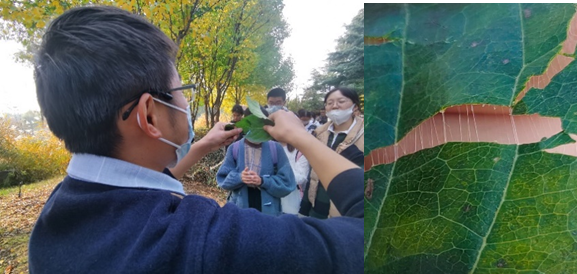 王老师从地上捡起来几片绿色的叶片,从中间撕开,可见其中的白色拉丝。王老师说,可别小看这些白色的丝状物(杜仲胶),它们具有高绝缘度并且耐腐蚀,被称为“中国橡胶”。杜仲是最好的橡胶资源,是保障国家橡胶安全的“战略树种”。杜仲橡胶具有“橡胶+塑料”二重性,是特种轮胎、海底电缆、雷达天线的优质原料。杜仲为我国十分重要的国家战略资源树种,既是世界上极具发展潜力的优质天然橡胶资源,又是我国特有的名贵药材和和木本油料树种,也是维护生态安全、增加碳汇、国家储备林建设、实现绿色养殖的重要树种。如果大家有兴趣,可以去明湖寻找它们的身影,撕开它们的叶子观察一下。