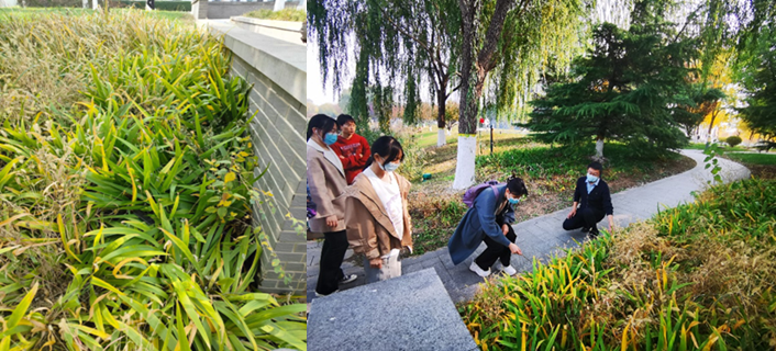 萱草又名解忧草、谖xuān草(谖即是忘),在我国有几千年载培历史,黄花菜是代表性种类。王老师向我们介绍说,萱草是百合科、萱草属植物。根近肉质,中下部有纺锤状膨大,用手捏一捏叶子的根部,可以感觉到中间是鼓鼓的。由于萱草根系发达,并且成片生长的特性,它可以起到可拦淤固土,防止水土流失的作用。