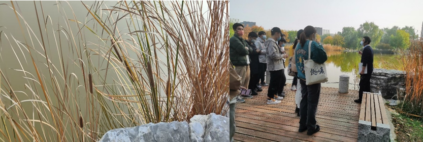 在明湖的栈道旁,王老师向我们介绍了一种湿地生态修复常用植物——香蒲。说起香蒲,可能首先想到的就是小时候拿着它拧一下爆开的细密手感以及将它们吹走后看它们迎风飞舞时的满足。