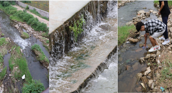 跟随书记的指引,我们六人开始对村内进行实地考察。首先我们到达了村里的石桥,石桥下是村里流淌的地表水,水比较清澈,水中没有垃圾,流量不大。我们在河边取了水,准备回去做进一步分析。