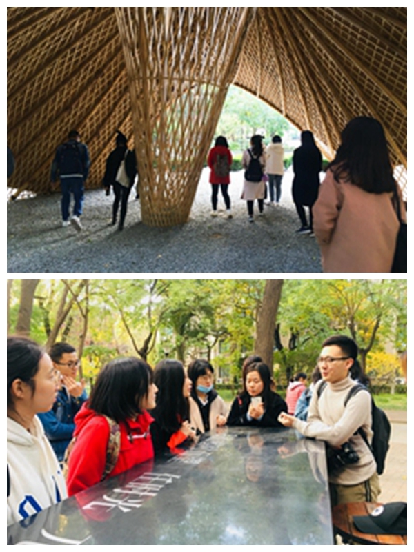 活动最后,北京林业大学的同学变身“导游”,带领北建大的同学开启了校园参观的旅程。林大同学结合自身专业特点,向我们重点介绍了建筑构思。林大主体教学楼嵌入了“树”的形状,不但实用、美观,还与林业大学的名字相呼应;以“纸”的几何空间为原型的桌椅亦是林大校园的一处风景;“留白”墙,顾名思义一个白色的墙面,同时也可以留下告白,是一个存有大量秘密的树洞;闪电广场则是以道路构建成闪电形状,秋天落叶全部扫至此处,从高处望下,形成一个不折不扣的金黄色的闪电;银杏大道,是赏秋的绝佳好地方,充斥着浪漫的气息。