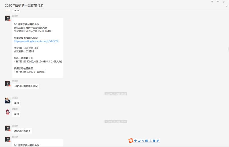 2020年2月14日下午,暖研第一党支部通过“腾讯会议”视频召开支委会和党员大会,在支委会上,支部书记陈亚飞询问了支委张静、沈祺、徐俊磊及党员代表郭浩然近期的生活情况,表达了党组织的关心关怀。