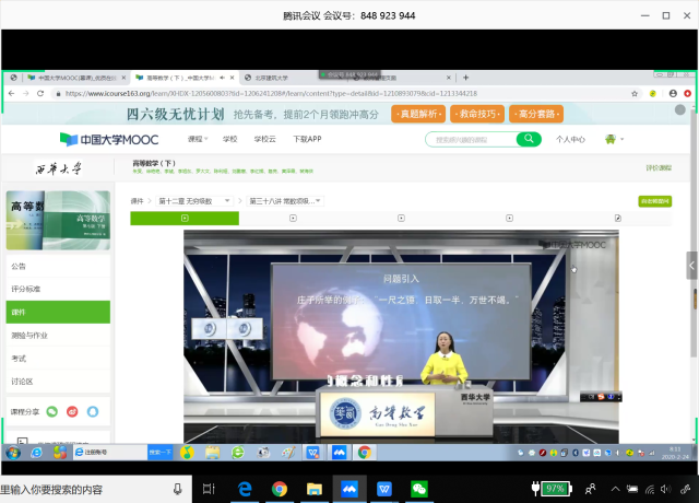 2月24日,我们本应在学校上课,受疫情影响,我们的课程由教室转到网上,吴老师在课程开始前半小时就在微信群发布通知,提醒大家按时上课,以防出现网络问题,老师同时开启“雨课堂”、“腾讯会议”。同学们准时上线,老师讲课从容,讨论区同学们互动不断,课程进行有条不紊。虽有网络卡顿的现象出现,但老师一次次耐心细致的询问“同学们能听到吗?”令人感动。