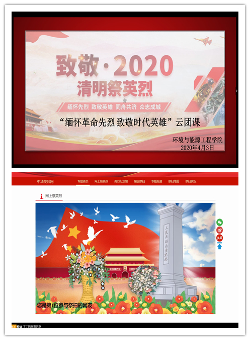 活动在线上奏唱团歌和“云献花祭英烈”中开始,同学们怀着崇敬的心情,登录中华英烈网,通过向烈士献花,学习英烈事迹,书写感言寄语等形式来缅怀革命烈士的丰功伟绩,表达对英烈的感恩和敬仰,整个祭奠过程庄严肃穆。随后,梁凯领学习近平总书记关于崇尚英雄、缅怀先烈的重要论述和赵一曼烈士的《一封家书》,丁丁结合本次新冠疫情防控,领学了战疫英雄先进事迹,致敬普通人的伟大心。与会师生共同观看《习近平讲述的战疫故事》,再次感受到中国在这次灾难面前体现出的制度优势,以及是如何“集中力量办大事”,展现出了强大的中国力量。水171陈佳琪、环研18崔申申等八位同学分享了“英雄,我想对你说”征文故事,赵诗蒙同学领读重温入团誓词,号召广大团员青年牢记誓词,践行青年使命。