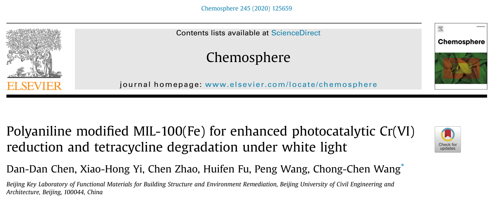 NMTer课题组硕士研究生陈丹丹在《Chemosphere》(SCI索引,中科院二区TOP期刊,影响因子5.108)上发表论文。该工作报道了通过机械球磨法制备了Z型异质结光催化剂MIL-100(Fe)/PANI,研究了其光催化还原Cr(VI)和降解四环素的性能,同时对材料的循环利用性和稳定性进行探究。最后提出Z型异质结机理来解释光催化活性提高的原因。