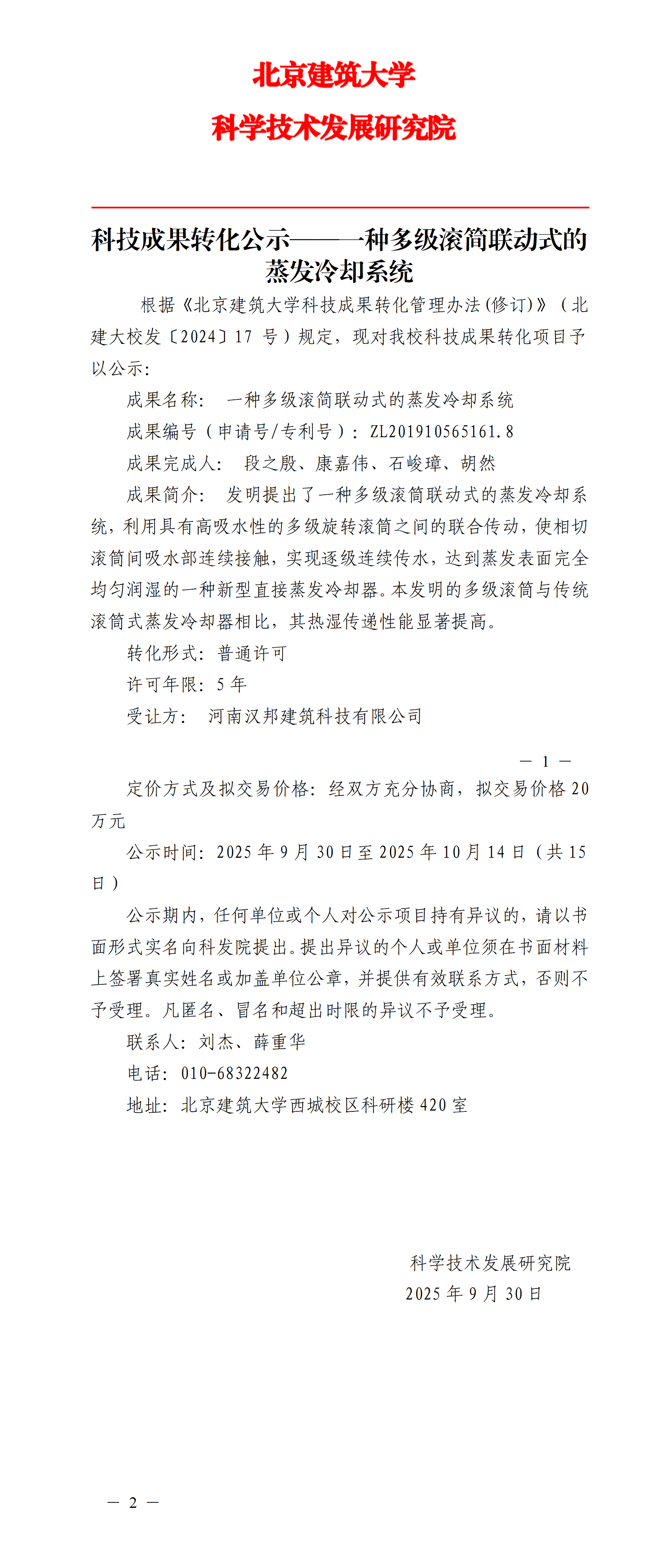 科技成果转化公示——一种多级滚简联动式的蒸发冷却系统