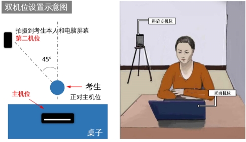 考生参加复试须使用“双机位”(如下图)。“第一机位”从考生正前方采集考生本人音视频信息,复试全程开启,摄像头取景范围不能过小,考生正面面容及双手须全程在视频录像范围内,桌子须紧靠墙壁,可视范围内不能有任何可能与复试相关的物品或资料。“第二机位”要能够采集考生所处环境的整体情况,位于复试场所远端,与考生后背成45°角,能够拍摄到考生本人和电脑屏幕,为避免干扰,第二机位复试全程只开启视频,关闭麦克风和扬声器。