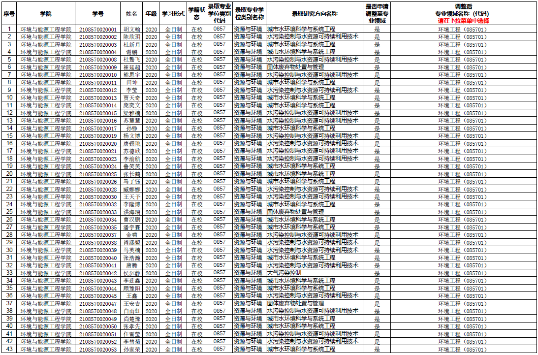 低端影视 工程类专业学位硕士研究生专业领域调整确认汇总表