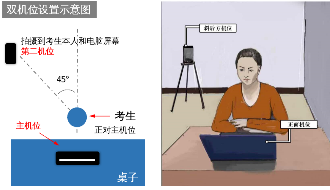 考生参加复试须使用“双机位”(如下图)。“第一机位”从考生正前方采集考生本人音视频信息,复试全程开启,摄像头取景范围不能过小,考生正面面容及双手须全程在视频录像范围内,桌子须紧靠墙壁,可视范围内不能有任何可能与复试相关的物品或资料。“第二机位”要能够采集考生所处环境的整体情况,位于复试场所远端,与考生后背成45°角,能够拍摄到考生本人和电脑屏幕,为避免干扰,第二机位复试全程只开启视频,关闭麦克风和扬声器。