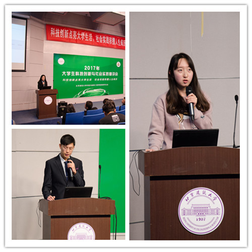 GREEN智能净化系统团队、高自洁净性TIO2纳米玻璃制备及性能团队和透水铺装系统与雨水控污效能研究团队,结合他们的科技创新项目,分别从科技创新的团队组建、团队合作、团队交流以及项目实施、论文撰写、参加竞赛等方面向同学们详细介绍参加科技创新具体内容及经验。同时,他们用自己的实际例子向同学们证明了无论参加那种竞赛都会得到很大的提升和锻炼。