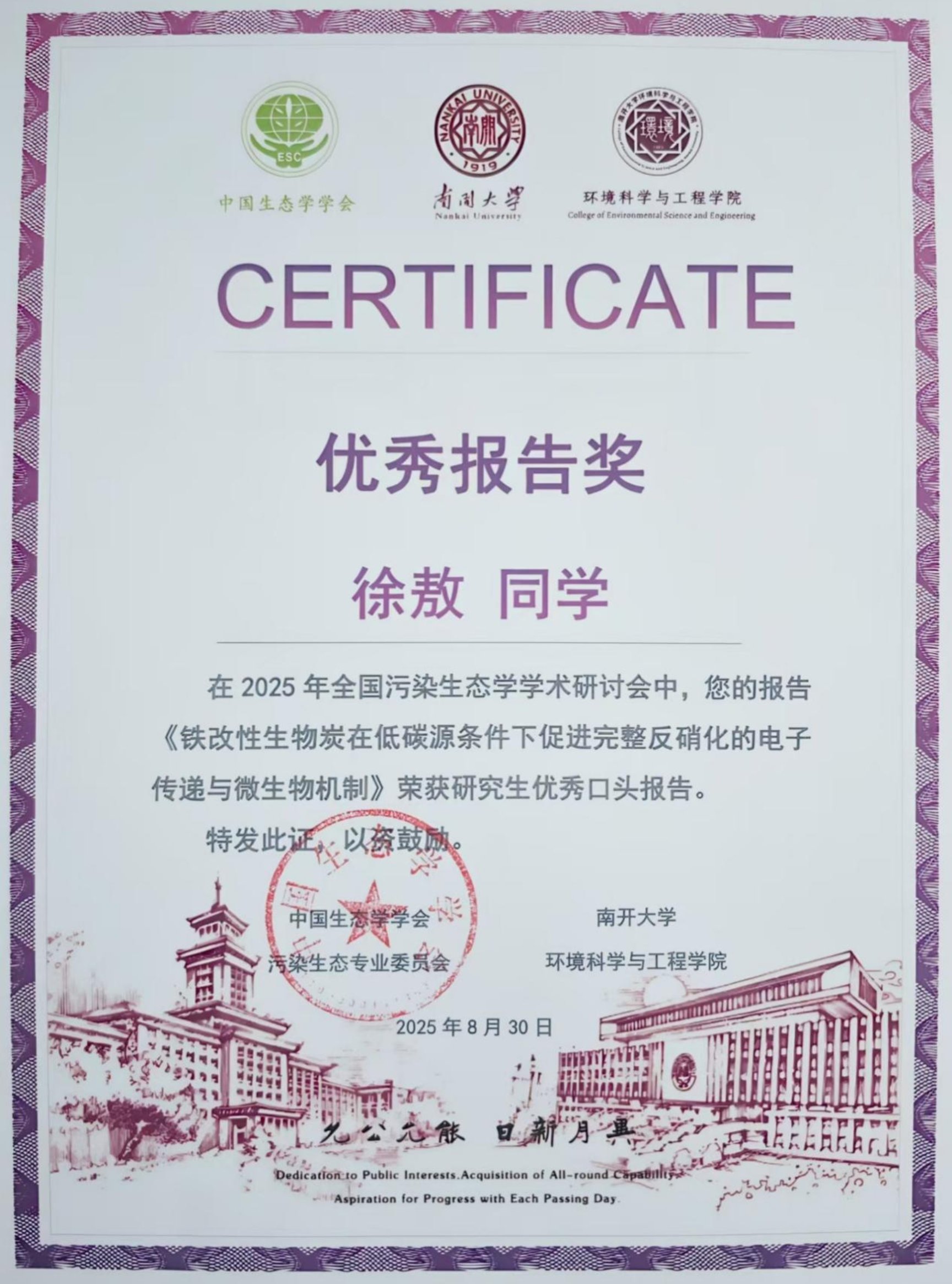 2025年8月29日-8月31日,环境生态修复课题组成员,高大文教授2022级博士生徐敖,参加由中国生态学学会污染生态专业委员会主办、南开大学环境科学与工程学院承办,中国科学院沈阳应用生态研究所、中国矿物岩石地球化学学会生态地球化学专业委员会和农业农村部环境环境保护科研监测所等党委协办的2025年全国污染生态学学术研讨会(暨中国生态学学会污染生态专业委员会五届三次会议)。会议围绕“新时期学科交融与生态环境可持续发展”主题,设置大会报告主会场、学术报告分会场、研究生专场和中美青年学术论坛,共计19个会场,邀请国内外污染生态学及相关领域科技工作者,共计215个报告,展示最新研究成果和前沿进展,共同探讨污染生态学新理论、新方法、新战略等,促进交流与合作,激发创新意识与社会责任感。