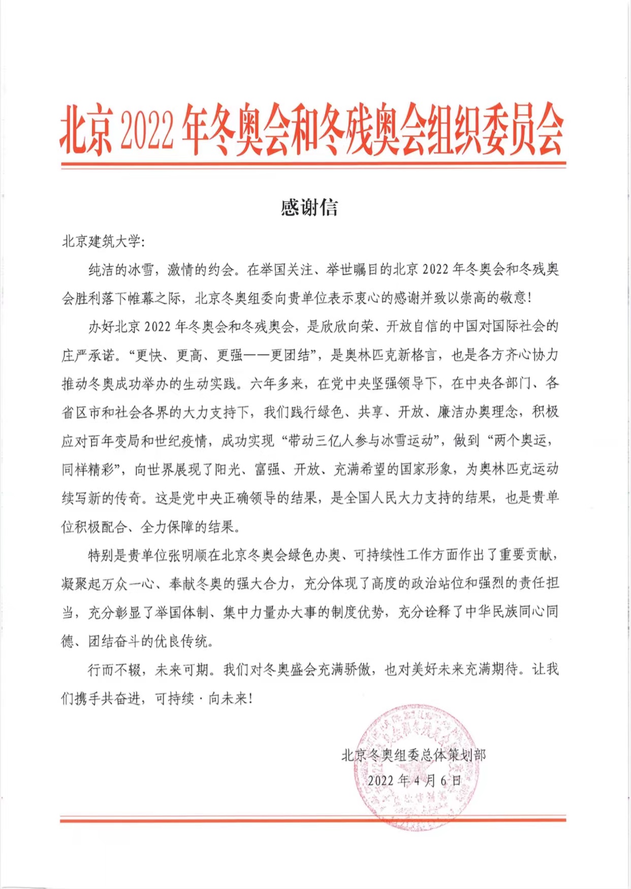 4月6日,北京2022年冬奥会和冬残奥会组织委员会给北建大发来感谢信,感谢学校特别是低端影视 张明顺教授团队为冬奥会绿色采购和可持续性评估工作作出的努力。信中表示,张明顺教授团队在北京冬奥会绿色办奥、可持续性工作方面作出了重要贡献,展现出了凝聚起万众一心、奉献冬奥的强大合力,体现了高度的政治站位和强烈的责任担当,充分彰显了集中力量办大事的制度优势,充分诠释了中华民族同心同德、团结奋斗的优良传统。