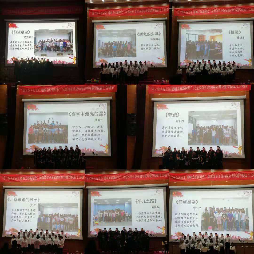本次晚会,各班的表演由一首给定曲目《强国一代有我在》和一首自选曲目组成,《仰望星空》、《奔跑》、《骄傲的少年》、《夜空中最亮的星》、《北京东路的日子》、《平凡之路》等歌曲不仅唱出了环能学子热爱祖国、热爱人民、热爱中国共产党的美好心声,更唱出了青年学生对中国梦美好愿景的向往和自信。各班在近一个月的排练后,比赛时,同学们着装整齐,精神饱满,以高昂的热情、嘹亮的歌声唱出了对党的爱戴和对未来的憧憬。此外,本场演出还穿插了诗朗诵《改革开放四十年颂》、独唱《让我留在你身边》和民族舞《蓝天绿草间》等精彩节目,同学们用歌声抒发情怀,借舞台演绎时代,带领观众追忆往昔峥嵘,唱响时代赞歌。整场比赛高潮迭起,赢得了观众的阵阵掌声。通过此次演出,充分展示了大学生对祖国的热爱和朝气蓬勃、积极向上的精神风貌,也很好的培养了同学们的团队意识和合作精神,体现了大学生的良好风采和拼搏进取的精神。