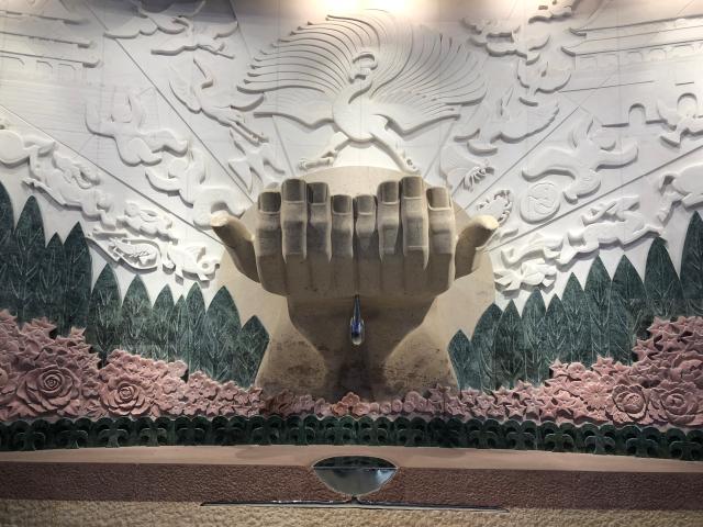 博物馆正门主要位置,是由中央美院老副院长侯一民的石刻壁画《生命之源》,从双手流淌出的水滴入五色土大地中,润泽万物。