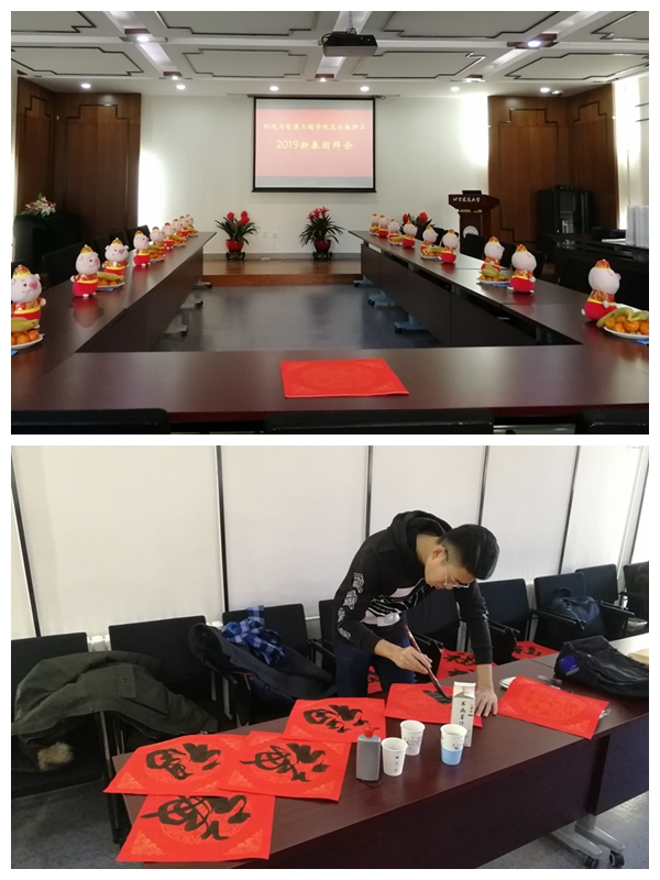 党政办精心筹备,用心布置,“猪事顺利”吉祥物列队欢迎,大红福字亲笔绘就增添喜气,喜庆的团拜会现场其乐融融,一片祥和欢乐氛围。学院为老师们准备了温暖的大红围巾,黄尚荣逐一为老师们佩戴,送上一片温情,还为老师们送上由我院研究生陈旭亲笔书写的“福”字,为老师们送上一份美好的祝愿,也表达了对老师们的一份感恩之情。