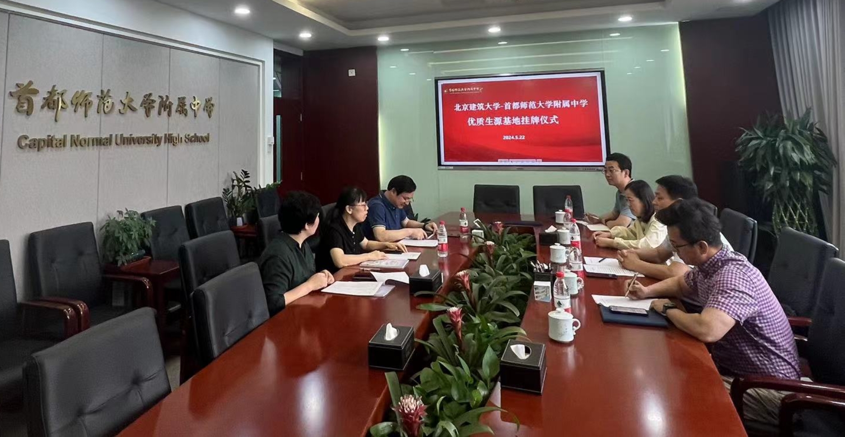 在首师大附中近几年录取情况,对北建大现有面向中学生开展的科技创新项目和平台条件做了详细的讲解,希望和首师附中加强联动,在中学生研学活动、科技创新辅导、高考志愿填报指导等方面开展多种形式的合作。