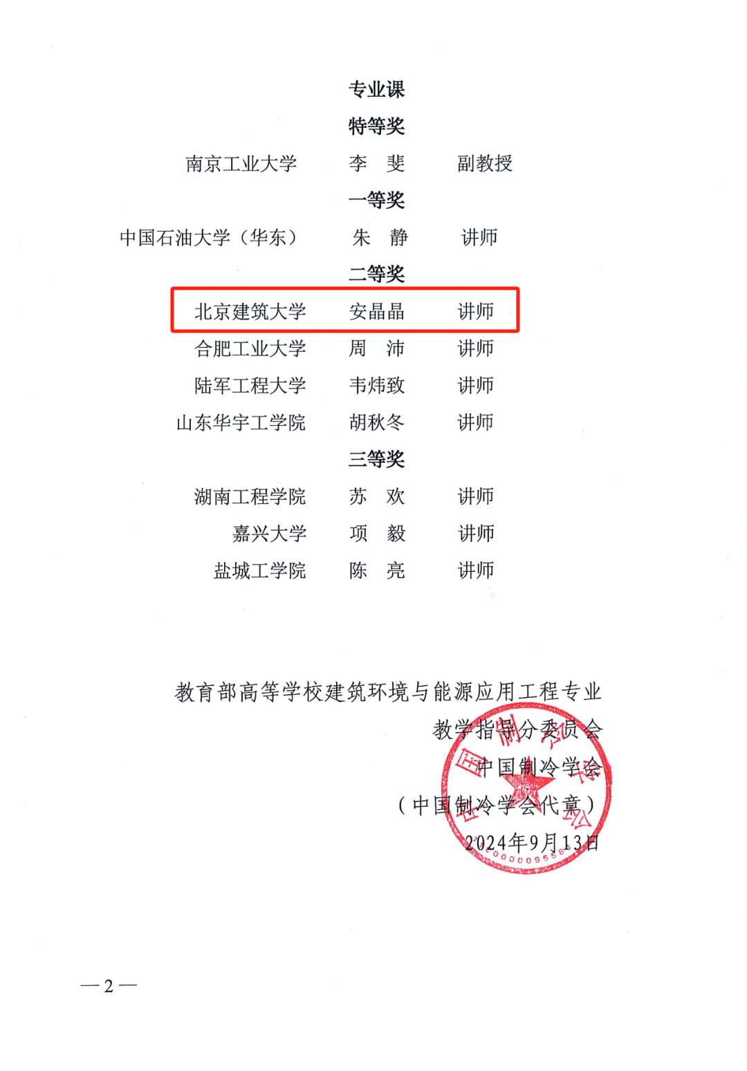 青年教师安晶晶老师获得了专业课组二等奖。该竞赛由教育部高等学校建筑环境与能源应用工程专业教学指导分委员会、中国制冷学会共同主办。据悉,本届竞赛共有来自全国28所高校(学院)的40名教师报名参赛,经过初赛和复赛两轮评比,安晶晶老师成功进入决赛并获二等奖,初赛、复赛和决赛分别是《冷热源设备与系统》专业课中“制冷与热泵的热力学原理”、“吸收式冷热水机组”和“蒸汽压缩式制冷/热泵机组”知识点。