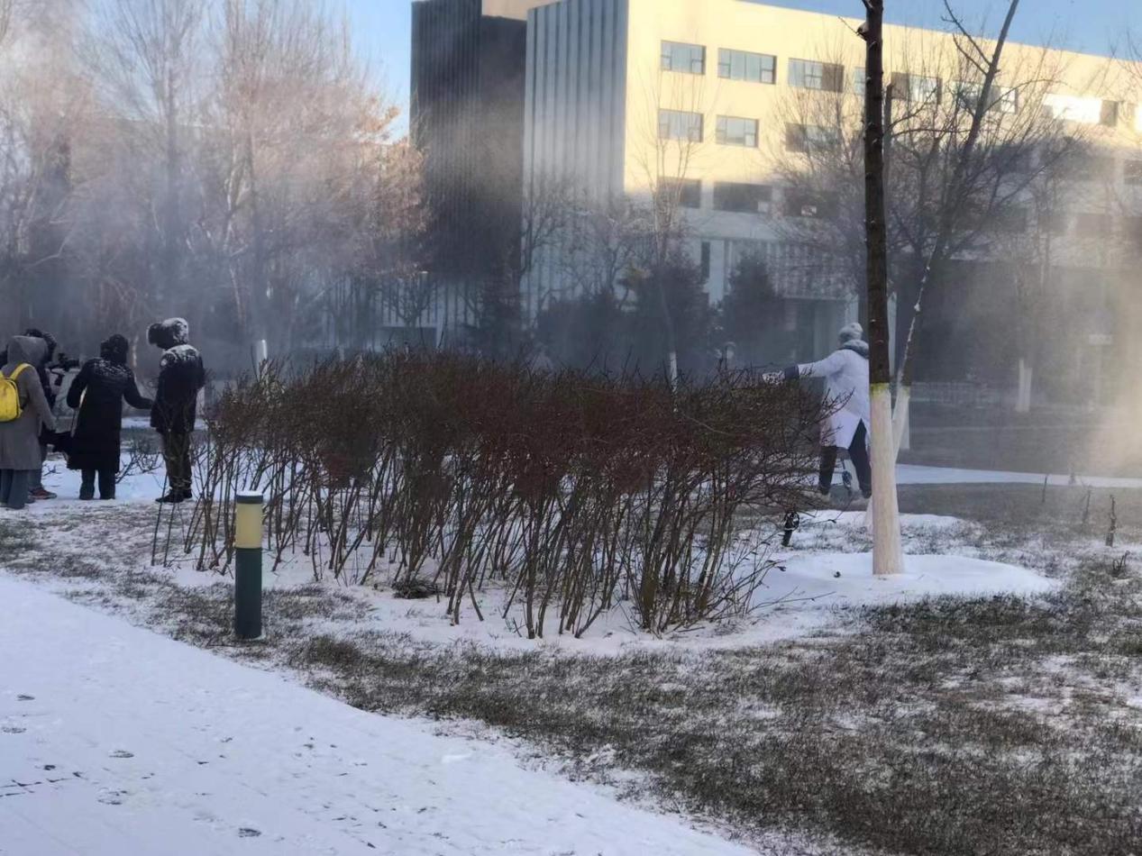 徐荣吉、吴海峰老师,清晨六点半带领学生开展室外造雪实验,实验场地成为校园内亮丽的雪景风景线和“网红”打卡地。此次实验主要目的是测试国产造雪机在各种环境条件下的造雪性能,为自主冰雪装备的发展做出支撑。