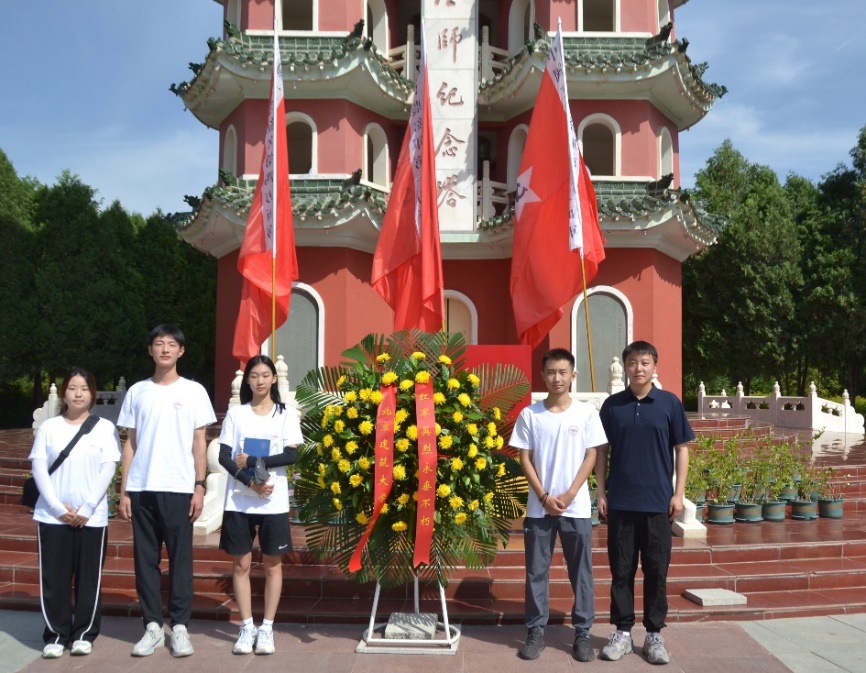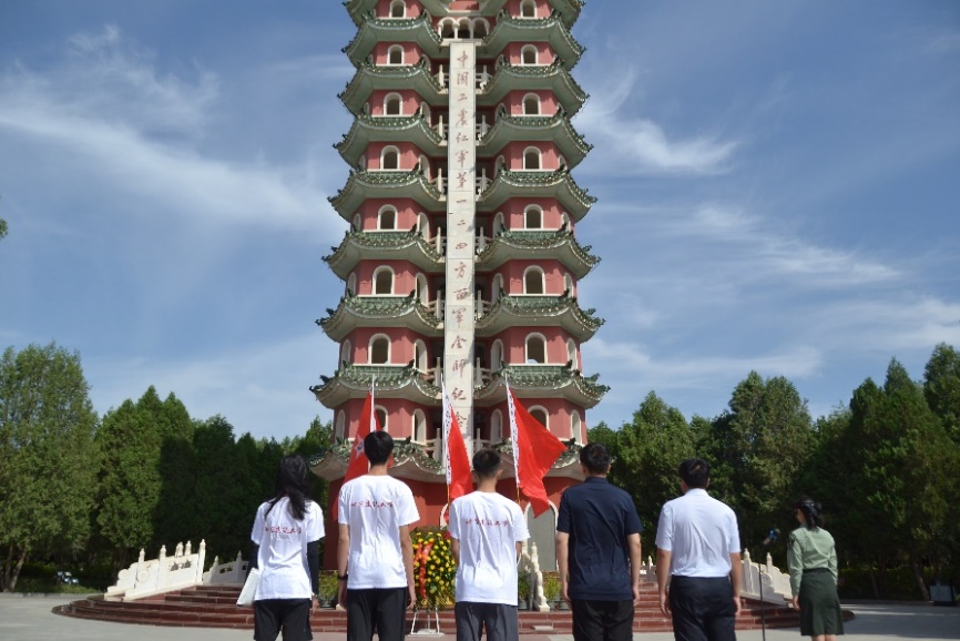 团队成员在纪念塔前默哀,向烈士敬献花篮,在讲解员的带领下合唱国际歌、重温入党誓词。