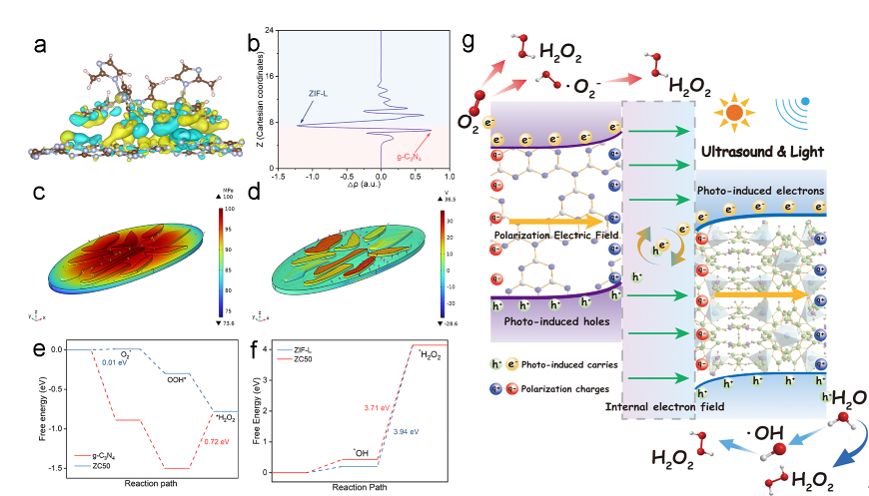 Figure 5 (a) The charge difference density between g-C3N4 and ZIF-L (the yellow represents the electron accumulation area, and the light blue represents the electron dissipation area); (b) the planar averaged charge density difference along z-axis; (c)-(d) simulated stress and potential distributions of ZC50; (e)-(f) calculated energy profile for reduction of oxygen into H2O2 and oxidation of water into H2O2 on ZC50; (g) schematic diagram of the piezo-photocatalytic synergistically promoting the H2O2 production.