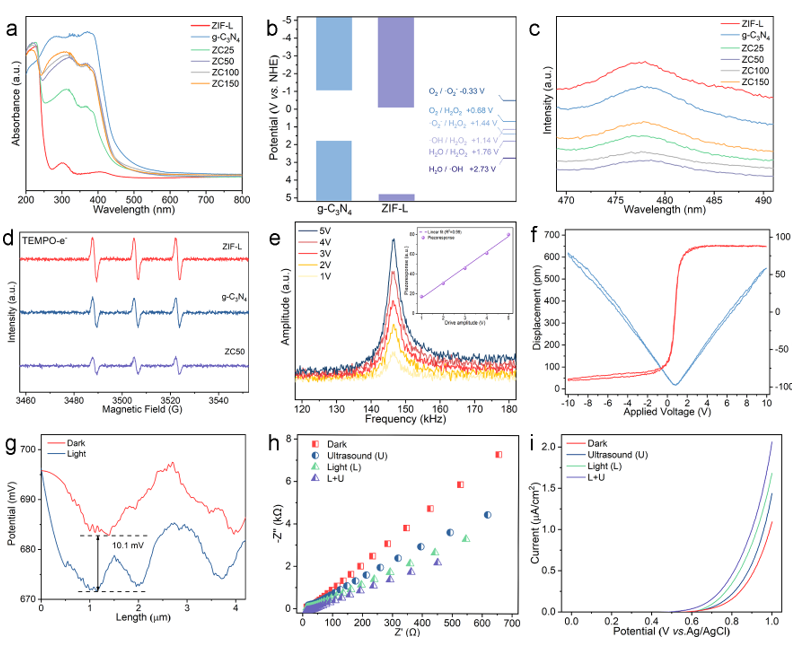Figure 2 (a) UV-Vis DRS spectra of g-C3N4, ZIF-L and ZCx catalysts; (b) scheme illustration of energy positions for g-C3N4 and ZIF-L materials; (c) PL spectra (λexcitation = 350 nm) of g-C3N4, ZIF-L and the ZCx catalysts; (d) the signal intensities of TEMPO-e- over different materials under light irradiation; (e) PFM resonant responses for different applied voltages of the ZC50 heterojunction; (f) displacement-voltage and phase curves of the ZC50 heterojunction; (g) the corresponding surface potentials of the ZC50 measured via KPFM technique under different conditions; (h) EIS and (i) LSV curves of the ZC50 measured under dark, ultrasound (U), light (L) and coupling (L+U) conditions.