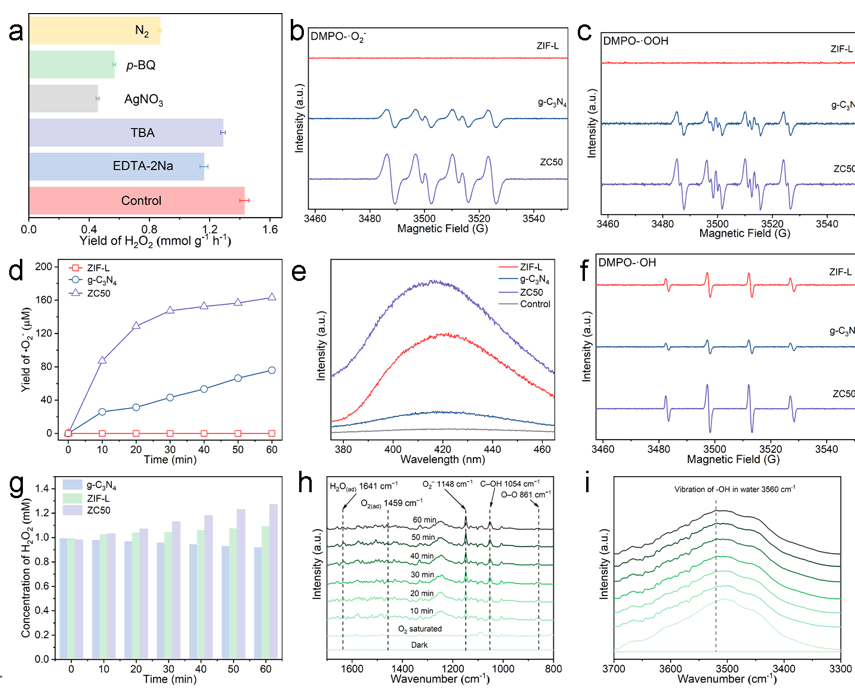 Figure 4 (a) Trapping experiments of radical scavengers for piezo-photocatalytic H2O2 generation by ZC50 heterojunction; (b)-(c) ESR spectra of ·O2− and ·OOH during the photoreaction by g-C3N4, ZIF-L and ZC50 materials; (d)-(e) quantitative analysis of ·O2− and ·OH radicals generated in g-C3N4, ZIF-L and CP-5 piezo-photocatalytic system via NBT and HTA probe test respectively; (f) ESR spectra of ·OH during the photoreaction by g-C3N4, ZIF-L and ZC50; (g) comparison of the H2O2 decomposition rate constant of g-C3N4, ZIF-L and ZC50; (h)-(i) in-situ DRIFT spectra of the ZC50 heterojunction.