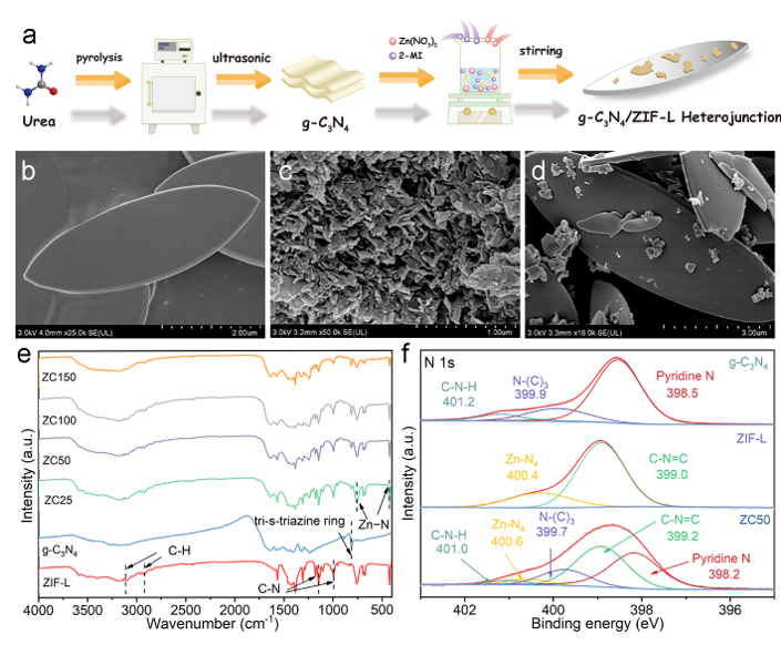 Figure 1 Preparation and structure characterizations of g-C3N4, ZIF-L, and ZC50 heterojunction. (a) representation of the basic synthetic scheme of ZCx catalysts; SEM images of (b) ZIF-L, (c) g-C3N4 and (d) the ZC50 sample; (e) FTIR spectra of g-C3N4, ZIF-L and ZCx samples; (f) N 1s XPS spectra of g-C3N4, ZIF-L and the ZC50 heterojunction.
