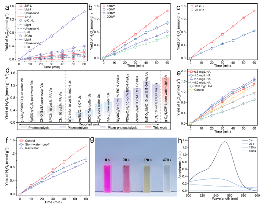Figure 3 (a) Performance of H2O2 production by g-C3N4, ZIF-L and the ZC50 heterojunction under different conditions; (b)-(c) piezo-photocatalytic production of H2O2 over ZC50 with different ultrasonic powers and frequencies; (d) a comparable chart of H2O2 catalytic efficiency for the ZC50 heterojunction and the other reported data; (e) piezo-photocatalytic production of H2O2 over ZC50 with different concentrations HA; (f) piezo-photocatalytic production of H2O2 over ZC50 in rainwater and stormwater runoff samples; (g) RhB decolorization process in the constructed photo-Fenton reaction system; (h) the variation of RhB characteristic peak intensities during the photo-Fenton process. Condition: catalyst = 0.5 g L-1, pH = 5.6, ultrasound frequency = 40 kHz, ultrasound power = 480 W.