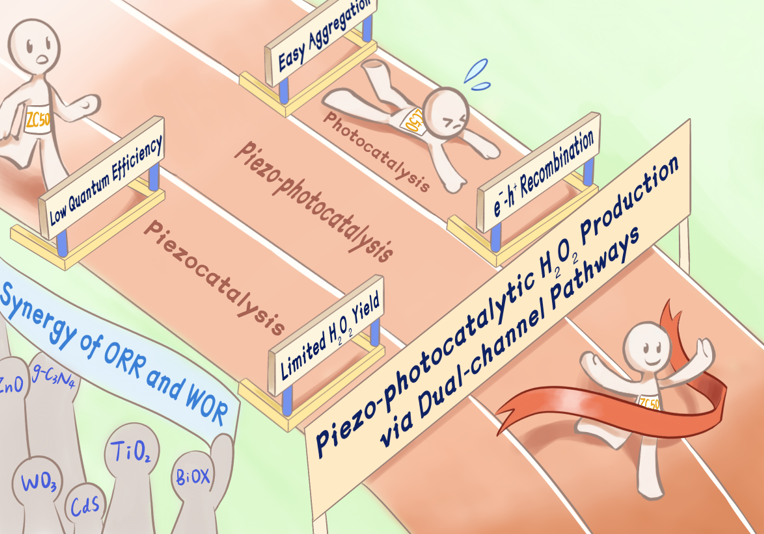 构建了基于ZIF-L/g-C3N4异质结的压电-光催化反应体系。在超声波能量的辅助下,催化剂体相和界面间会形成极化电场,其为载流子在异质结界面处的定向迁移提供了强有力的驱动力,实现了纯水体系下(零牺牲剂添加)高效的H2O2催化合成;