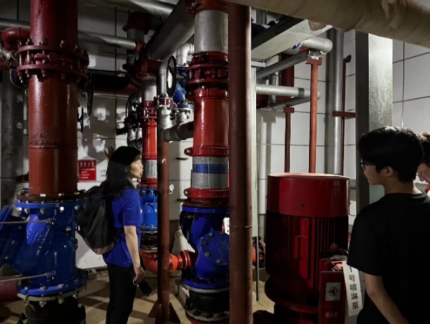 供排水特点、水源及组成,强调了在设计中具体问题具体分析并灵活解决的能力培养。之后,为保证参观认识效果,将小组分为6组,分别由邵宗义、许萍、杨海燕和刘然彬四位老师带队交叉参观,对给水、消防、热水、中水站的设备、工艺构成展开了实景介绍,强化原理掌握和空间立体感的培养。
