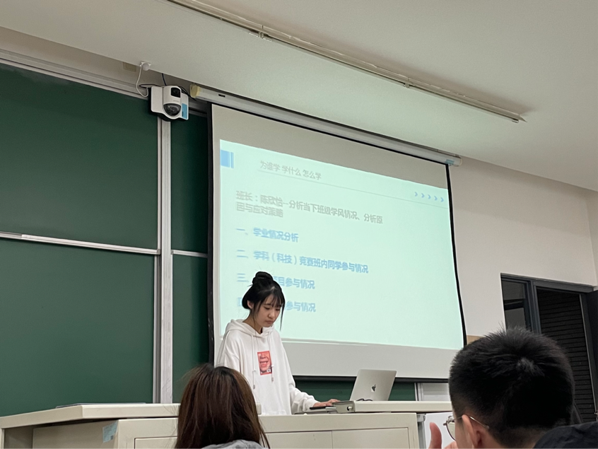 随后班长陈欣怡对班级学风现状,学业情况,竞赛活动,文艺类活动及社会实践类活动做了总结分析。