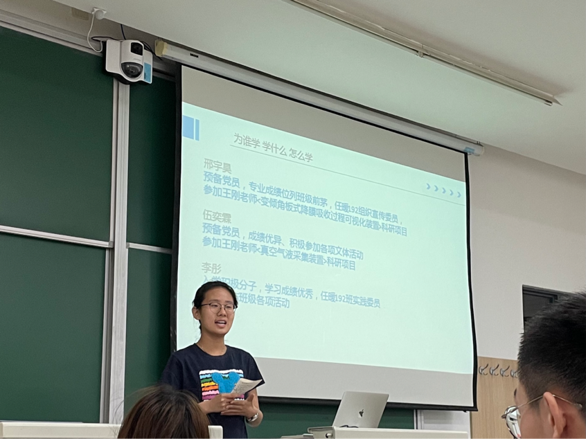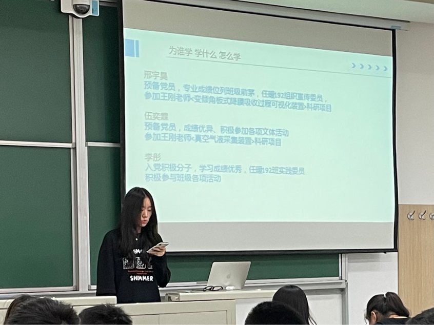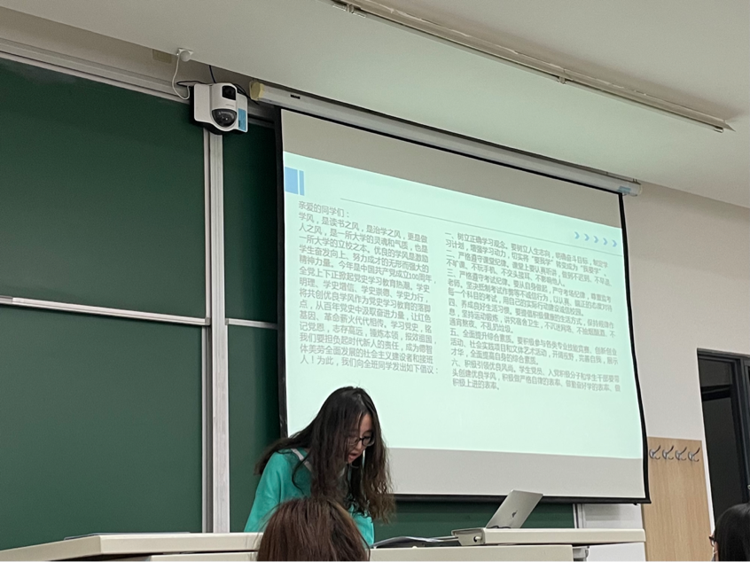 团支书贾韵聪对班内存在的一些问题做了改进措施落实并进行了团日主题工作总结,并由学委王林领读学风倡议书。