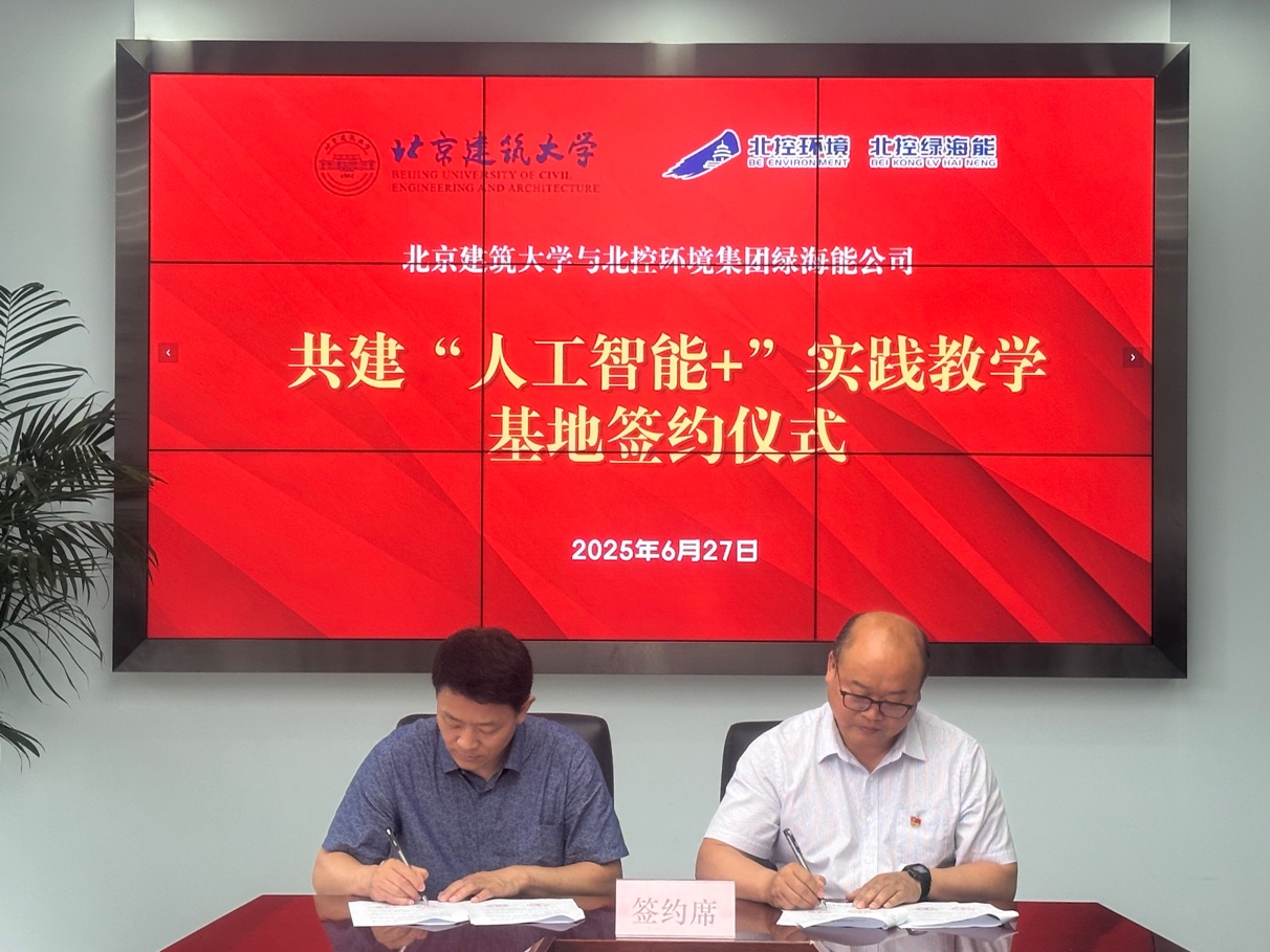 与北控绿海能环保有限公司共同签订了校外实践教学基地合作协议,标志着“人工智能+”共建基地正式挂牌成立。学院党委书记冯宏岳、副院长仇付国、环境工程专业负责人王建龙,北控环境集团党委委员、副总裁王炬炜,北控环境集团采购部总经理张坤、北控绿海能公司总经理武继旭等人出席了签约仪式。