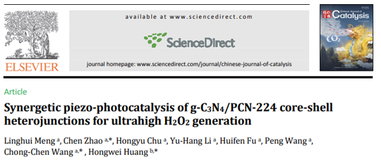 王崇臣教授团队与中国地质大学(北京)黄洪伟教授团队合作制备了具有“核-壳”结构的g-C3N4/PCN-224异质结催化剂,其压电-光催化制备H2O2产率可达4.86 mmolg-1h-1,性能优于现有大部分MOFs基和g-C3N4基催化剂。相关研究成果以“Synergetic Piezo-photocatalysis of g-C3N4/PCN-224 Core-Shell Heterojunctions for Ultrahigh H2O2Generation”为题,发表于《Chinese Journal of Catalysis》。