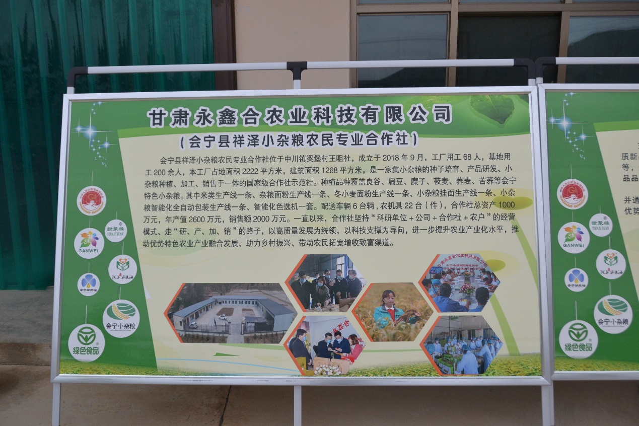 据负责人介绍,合作社成立于2018年9月,是一家以小杂粮的种子繁育、产品研发、杂粮种植、加工、销售于一体的合作社。小杂粮种植品种覆盖良谷、扁豆、糜子、莜麦、荞麦、苦荞等会宁特色小杂粮,截至目前已认定8个绿色产品,6个地标产品,获得4项专利,制定了3个企业产品执行标准,同当地红色文化相结合,形成了独具地方特色的高质量农产品。