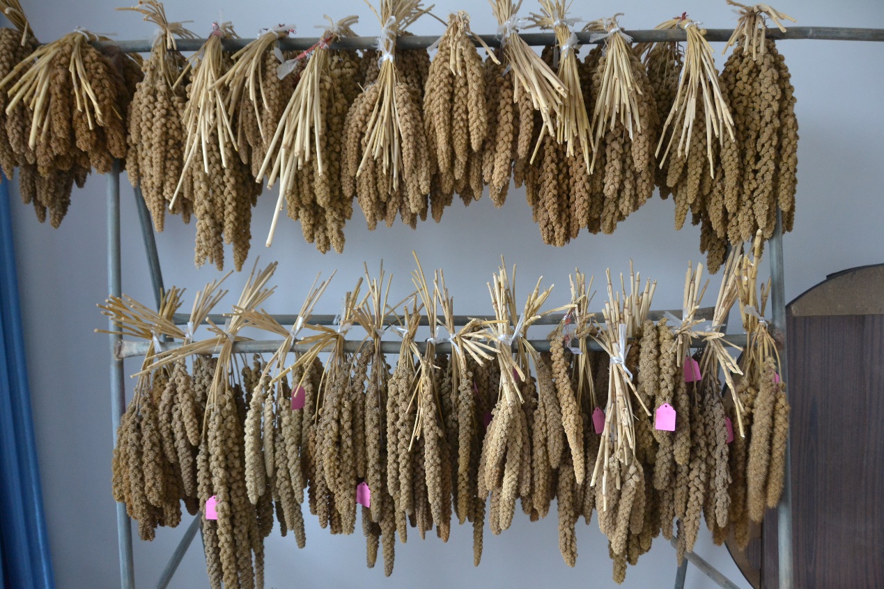 董孔军所长向团队成员讲解:“我们能看到这里展示的穗子是有长刚毛、排列紧密的,同时也有这种长鞭型短毛的。一个好的品种要进行十年培育、层层选拔。我们七千多个样本选拔出40多个,再进行培育观察。不仅要保证在本地有好的产量,还要在每个地方都有好的产量”。