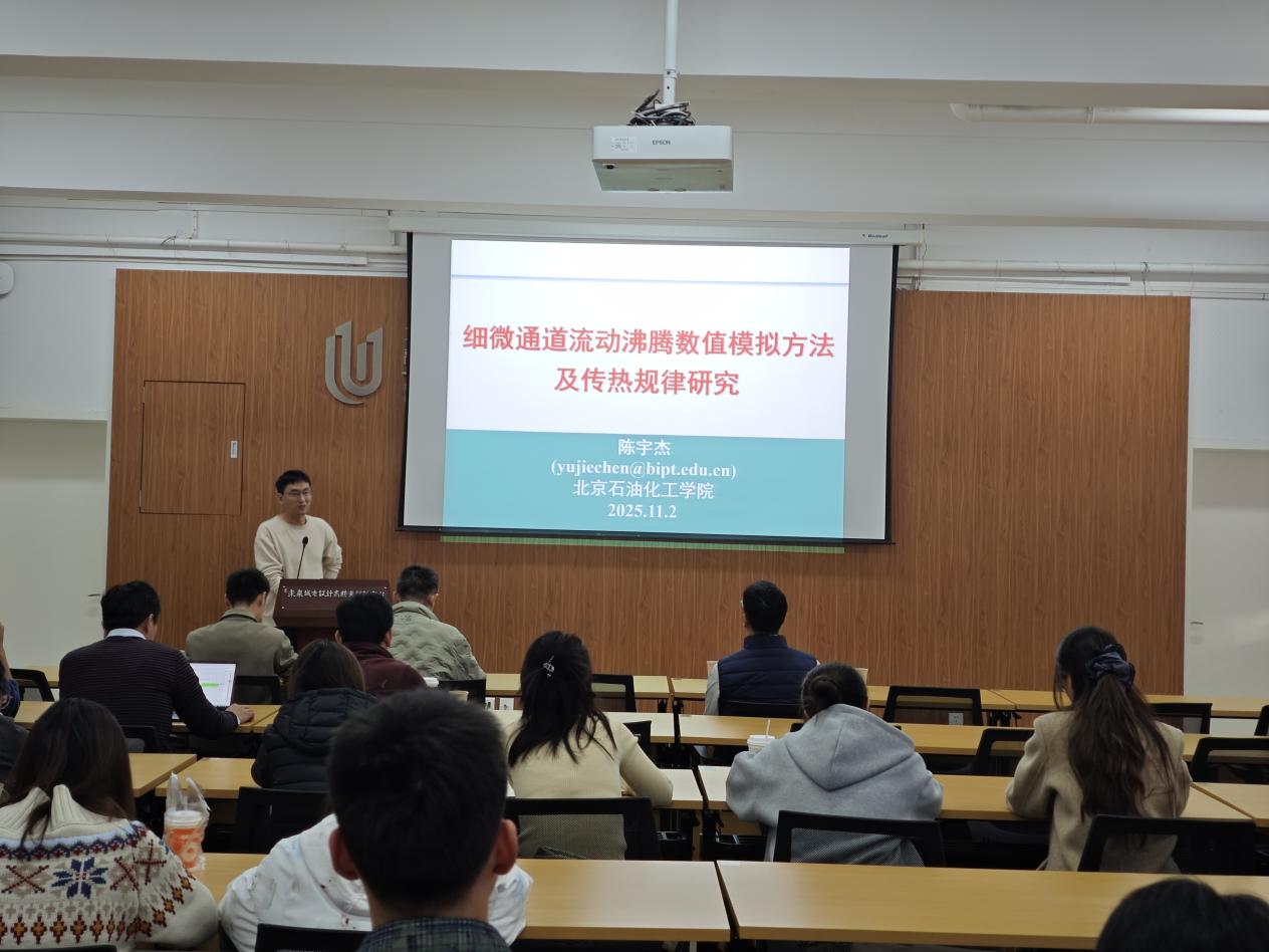 陈宇杰研究员以《细微通道流动沸腾数值模拟方法及传热规律研究》为题,系统介绍了细微通道内流动沸腾的数值模拟方法与传热特性,为强化沸腾传热技术研究提供了新的思路与方法支撑;李威副教授以《基于吸附式储热的电池智能热管理策略》为题,结合当前新能源电池热管理中的关键问题,重点阐述了吸附式储热技术在提升电池热管理效率与安全性方面的应用潜力与创新路径;聂昌达副教授以《磁热转换功能复合相变材料及高效相变储热技术》为题,聚焦磁热转换与相变材料的交叉融合,介绍了复合相变材料在能量储存与转换领域的前沿进展,拓展了新能源储热技术的研究思路。