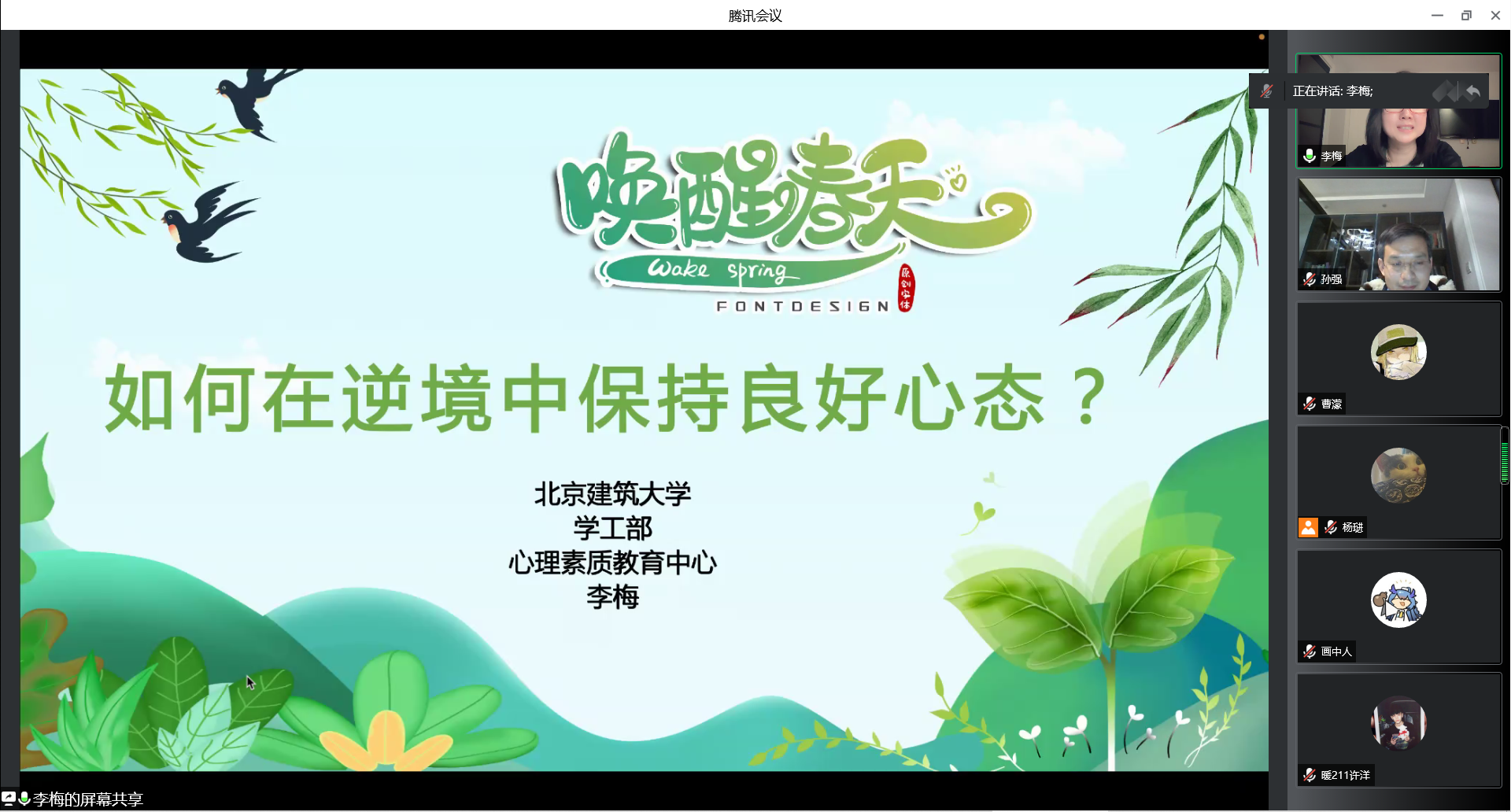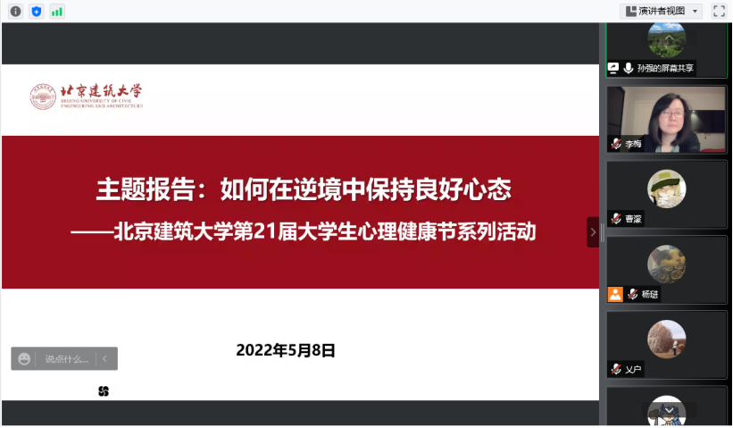 为增强学生应对疫情和克服困难的信念信心,5月8日晚,大学生心理素质教育中心主任李梅副教授在线开展了以“如何在逆境中保持良好的心态”为主题的心理讲座。心理委员、学生骨干以及在校学生等近170名同学聆听了讲座,共同体验自己的情绪,学习了改善情绪的方法。讲座由低端影视