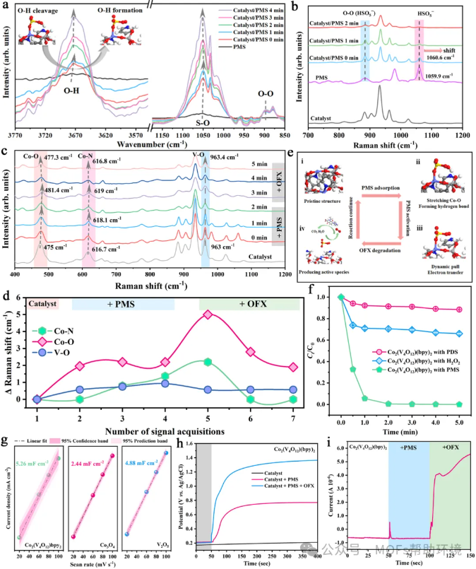 图4(a)Co2(V4O12)(bpy)2/PMS体系在N2氛围下的原位红外光谱。(b)Co2(V4O12)(bpy)2、PMS及二者反应过程中的原位拉曼图谱。(c)原位拉曼光谱中不同金属键的伸缩变化。(d)不同金属键在反应中的伸缩振动位移。(e)类芬顿反应过程中PMS的活化机理及OFX氧化机理。(f)不同的活化剂对OFX降解效率的影响。(g)根据Co2(V4O12)(bpy)2、Co3O4和V2O5的CV曲线进行的ECSA测量。使用Co2(V4O12)(bpy)2作为工作电极的(h)开路电压曲线和(i)i-t曲线。