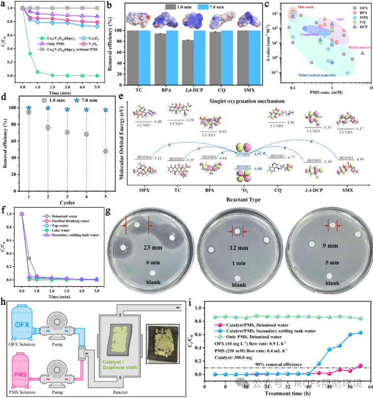 图2(a)不同催化剂的类芬顿反应活性测试。(b)Co2(V4O12)(bpy)2/PMS体系对TC、BPA、3,4-DCP、CQ和SMX的降解效率。(c)Co2(V4O12)(bpy)2与已报道过的催化剂的性能对比;(d)Co2(V4O12)(bpy)2催化降解OFX的循环实验。(e)1O2对多种富电子微污染物的氧化机理。(f)Co2(V4O12)(bpy)2在真实水体中对OFX降解效率的影响。(g)经Co2(V4O12)(bpy)2/PMS体系降解后的OFX溶液对大肠杆菌的抑菌圈图像。(h)连续降解OFX的固定床反应器(插图:Co2(V4O12)(bpy)2粉体固定在石墨毡的实物图像)。(i)不同体系在反应器中对OFX的降解效率。