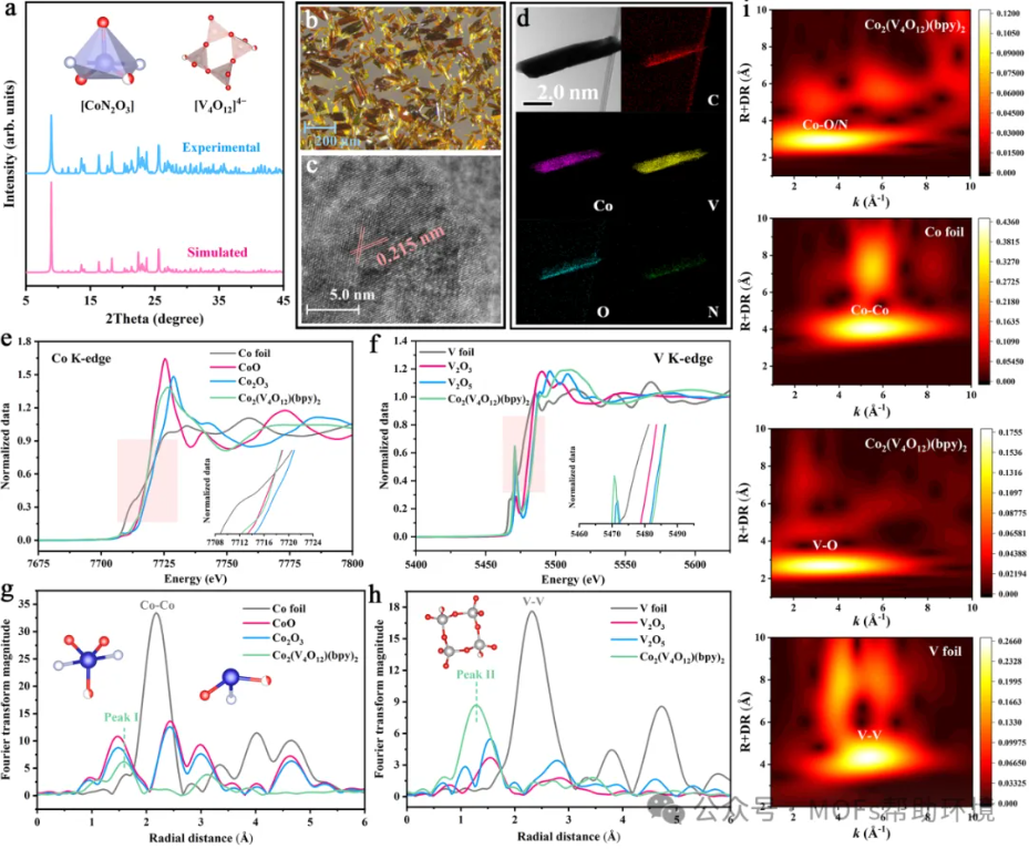 图1Co2(V4O12)(bpy)2的(a)PXRD图;(b)光学显微镜图像;(c)HR-TEM图像;(d)TEM图以及相应的元素映射分布图。Co2(V4O12)(bpy)2的(e)Co K-edge XANES光谱;(f)V K-edge XANES光谱;(g)Co K-edge FT-EXAFS光谱;(h)V K-edge FT-EXAFS光谱图和(i)Co与V的小波变换图。