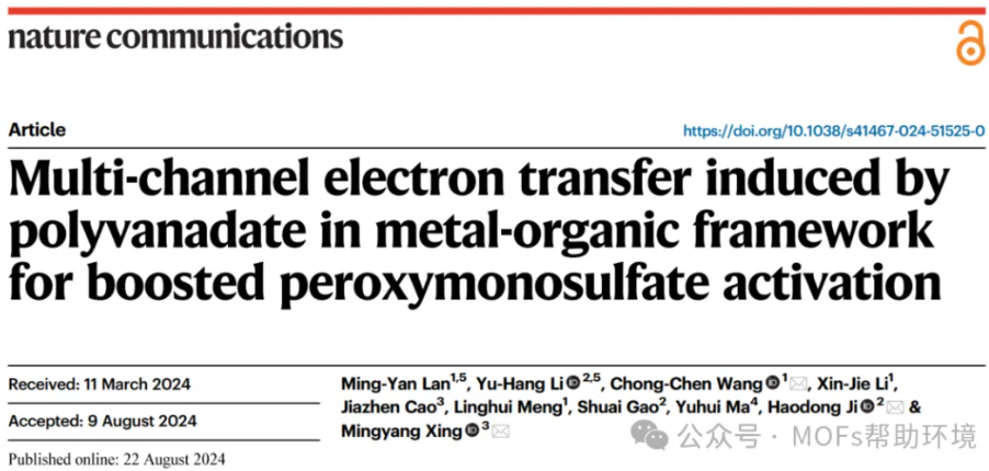 文献信息:Ming-Yan Lan, Yu-Hang Li, Chong-Chen Wang, Xin-Jie Li, Jiazhen Cao, Linghui Meng, Shuai Gao, Yuhui Ma, Haodong Ji, Mingyang Xing. Multi-channel electron transfer induced by polyvanadate in metal-organic framework for boosted peroxymonosulfate activation,Nature Communications(2024), 10.1038/s41467-024-51525-0.
