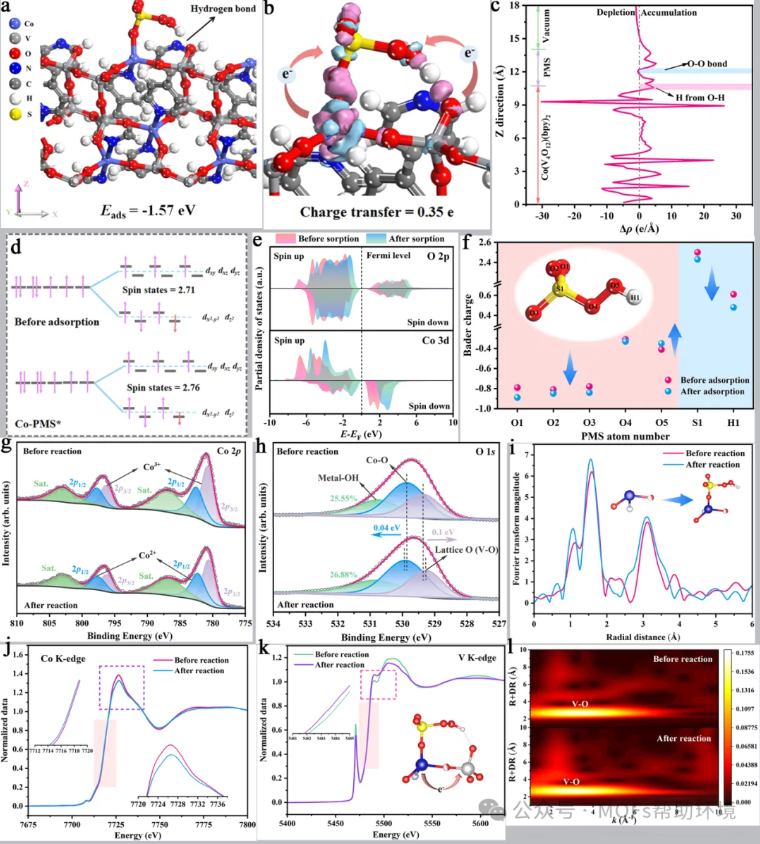 图3(a)最佳PMS吸附模型及相应的吸附能。(b)最佳PMS吸附模型的差分电荷密度。(c)基于差分电荷密度的平面平均电子密度差Δρ (Z)。(d)PMS吸附前后Co 3d轨道的电子填充情况和自旋态变化。(e)PMS吸附前后O 2p和Co 3d的PDOS谱图。(f)PMS在吸附前后的Mulliken电荷变化。Co2(V4O12)(bpy)2在反应前后的(g)Co 2p和(h)O 1s的XPS谱图。反应前后Co2(V4O12)(bpy)2的(i)Co K-edge EXAFS谱图。(j)Co2(V4O12)(bpy)2的Co K-edge EXAFS谱图;(k)V K-edge XANES谱图和(l)WT图。