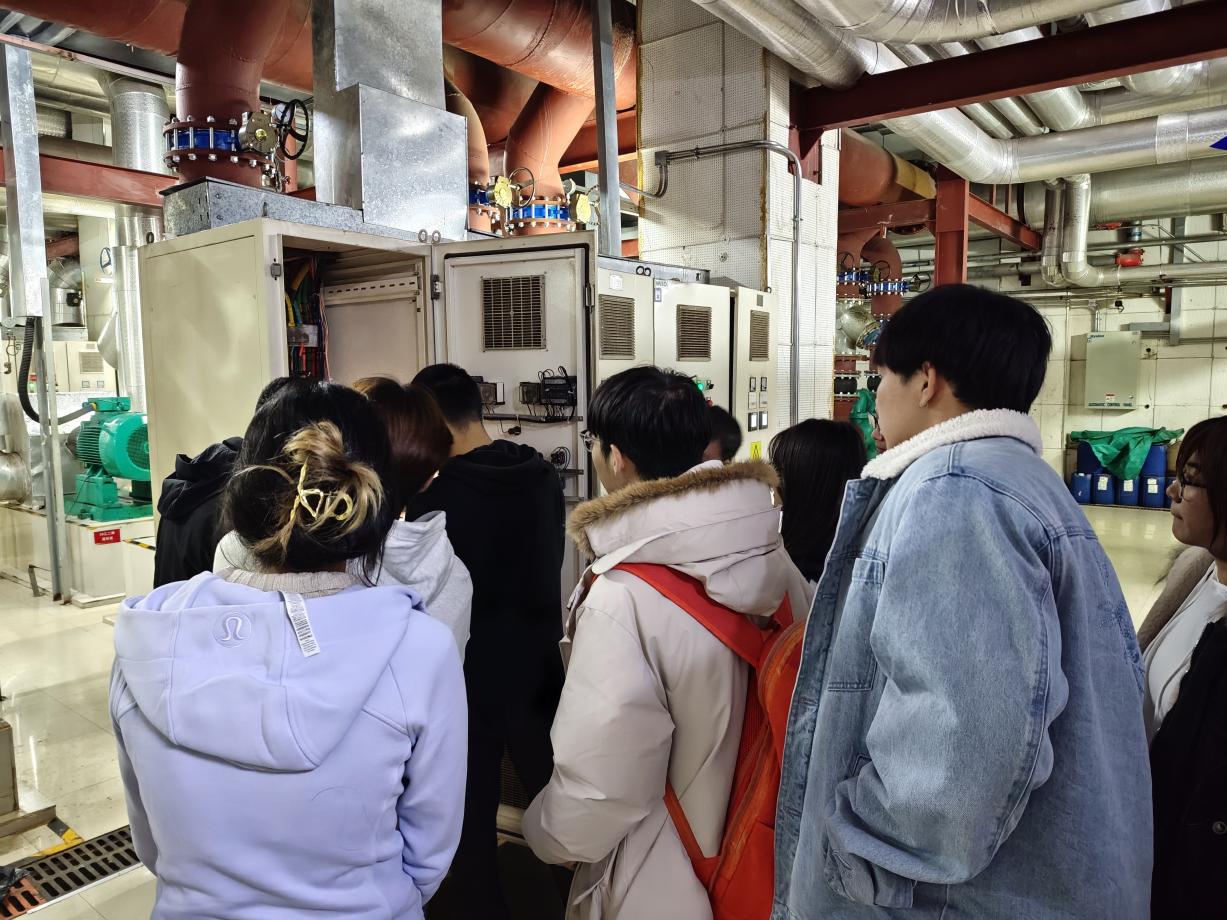 最后,单祥经理带领师生参观了冷热站自控系统,近距离了解冷热源设备和传感器,并讲解其工作原理与调节机制。他还介绍了智能化改造过程中一些有意思的问题,如用水浸线环绕配电柜实现漏水防水报警,保障设备运行安全。