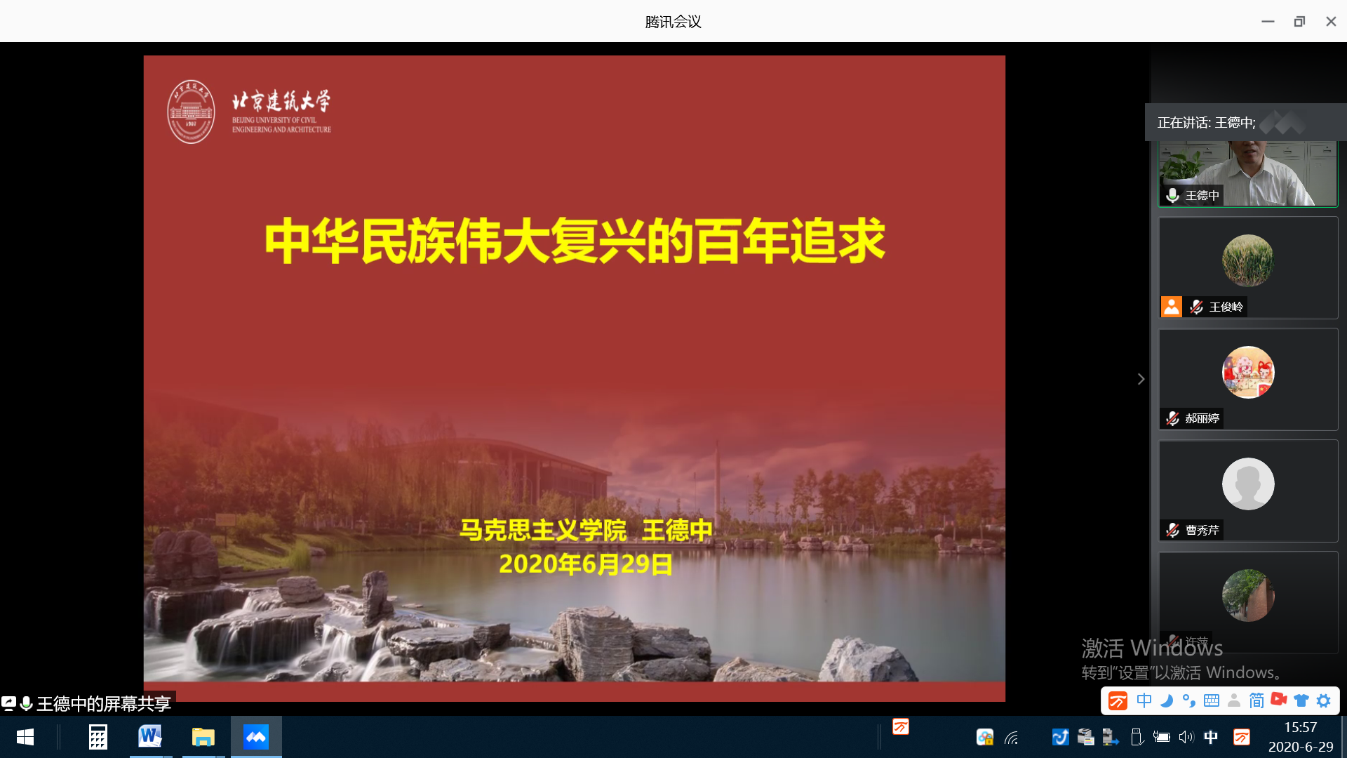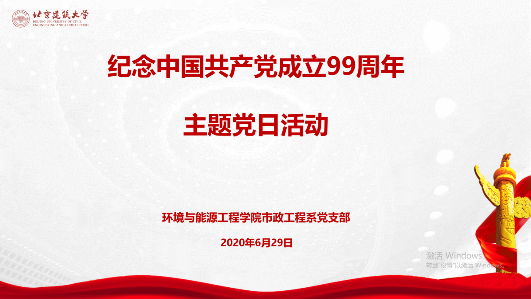 2020年6月29日,市政工程系党支部开展了纪念中国共产党成立99周年主题党日活动,全体在校支部党员参加了线上活动。活动主题是“治理有我、健康强国”,活动邀请马克思主义学院直属党支部书记王德中教授讲党课,题目是“中华民族伟大复兴的百年追求”。会后支部党员进行了讨论学习。