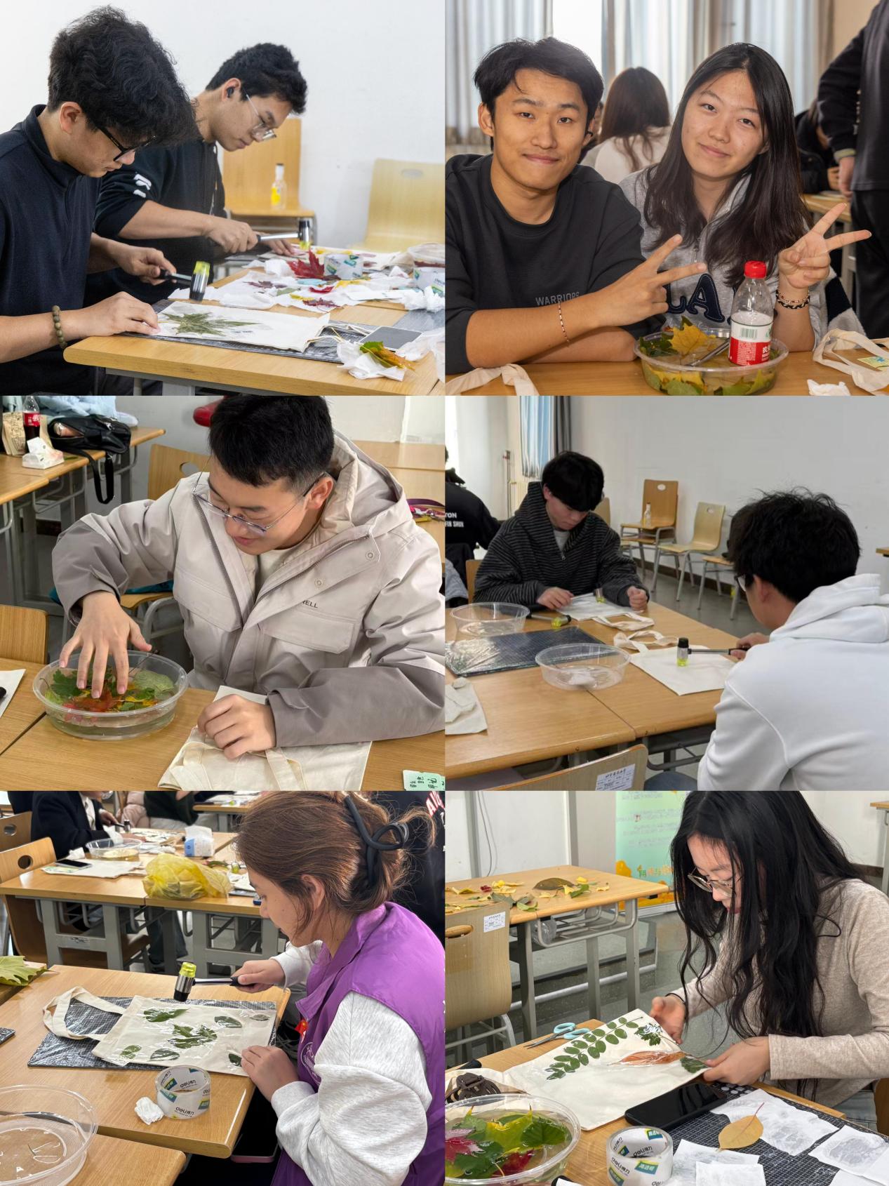 在制作过程中,志愿服务中心成员讲解了植物拓印活动的举办目的,实践技巧以及安全事宜。参与者迅速投入创作,现场氛围热烈欢快,通过敲击使植物汁液渗透载体,留存自然印记,既是非遗智慧的延续,也是对植物形态的科学记录。