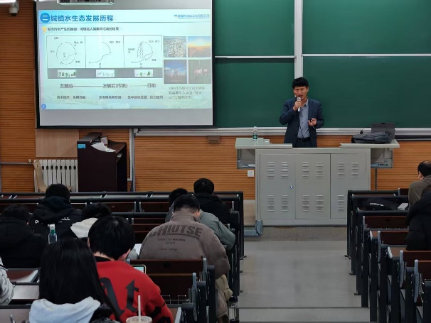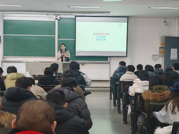 1月10日,北京北排清洁能源投资有限公司总经理王绕校友以“库网河厂一体化有效保障水生态持续改善”为主题,结合实际案例,为学生讲解了城镇水生态问题及综合解决方案。