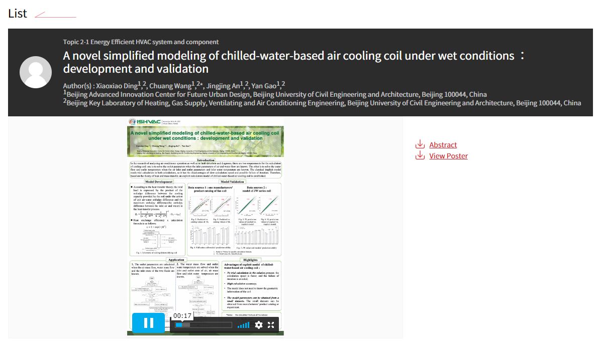 近日,我院硕士生丁晓晓题为“A novel simplified modeling of chilled-water-based air cooling coil under wet conditions: development and validation”的论文在ISHVAC2021国际供热通风及空气调节学术会议中获得“最佳论文奖”。2021年第12届ISHVAC国际学术会议由韩国主办,于11月24日至26日线上召开。ISHVAC系列会议最早发起于清华大学,已历时1991,1995,1999,2003,2007,2009,2011,2013,2015,2017,2019年共十一届,目前是由中国发起、暖通空调领域最有影响的国际学术会议之一。本届会议系首次走出国门举办,由韩国建筑可持续环境与设备系统研究院(KIAEBS)承办,并得到韩国旅游发展局、首尔市政厅、美国采暖制冷与空调工程师协会(ASHRAE)等机构和组织支持。