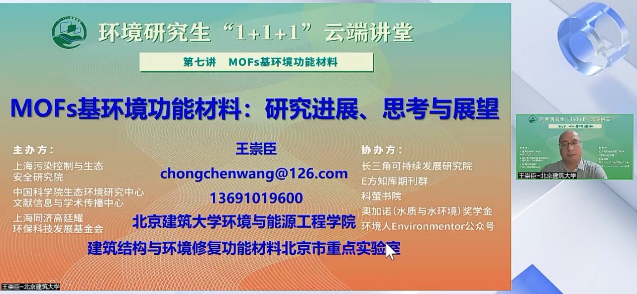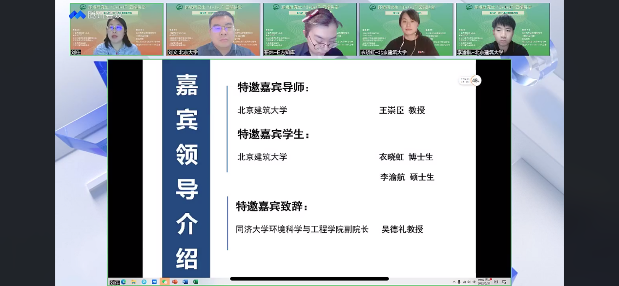 王崇臣教授、博士生衣晓虹和硕士生李渝航。来自各地方100多所高校、科研机构、企业的4000余位师生在线参加了此次讲座。同济大学环境科学与工程学院副院长吴德礼教授致欢迎辞。北京大学刘文教授和同济大学刘佳教授主持此次活动。